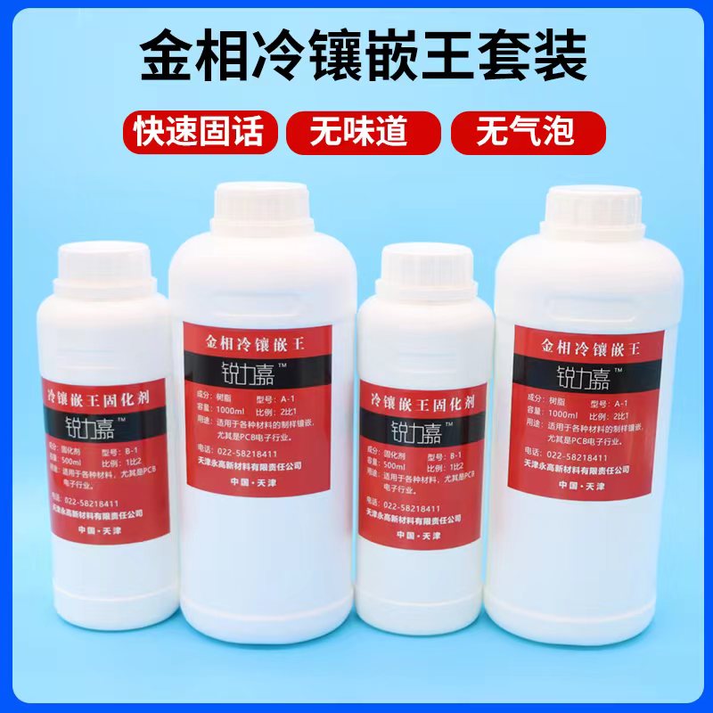 冷镶嵌王树脂 包装: 树脂1000ml液体+ 500ml固化剂 附件:Ф30冷镶嵌模1个 + 塑料杯、搅拌棒如水晶般透明。固化时间:25℃ 30分钟~2小时