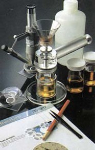 5. 观察膜片上的颗粒5.1 打开膜片盒,将其放在显微镜下。5.2 将电筒放到架上,打开开关。调整光柱使膜片能接受光亮。5.3 通过旋转显微镜边上的旋钮来调整显微镜的焦距,慢慢转动膜片盒以观察膜片上颗粒的全貌。也可以用镊子夹住膜片边缘慢慢移动膜片来观察。注:对于每个比例尺为01mm*100,每小格为10微米,对于每个例尺为001*50,每小格为25微米。