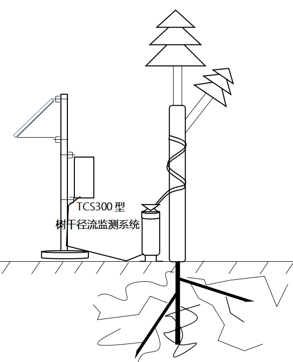 TCS300型自动树干径流监测系统是北京博伦径公司根据森林生态研究的水量平衡开发的一款新型自动树干径流监测仪,“树干径流量”便是其中的一个研究对象。我国林业行业标准LYT 1606-2003《森林生态系统定位观测指标体系》中明确指出“降落到森林中的雨滴,其中一部分从叶转移到枝,从枝转移到树干而流到林地地面,这部分雨量称为树干径流量”。TCS-系列树干径流监测系统则能够很好的用来采集及分析这部分的雨量。