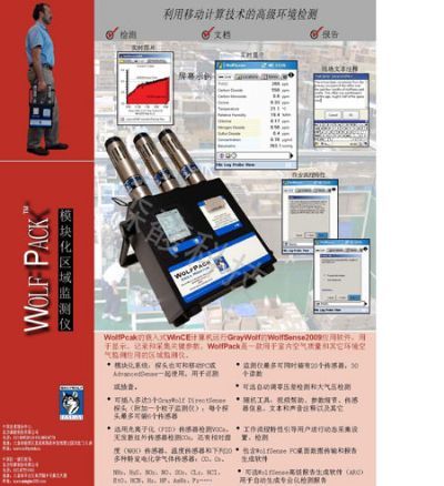 WolfPcak的嵌入式WinCE计算机运行GrayWolf的WolfSense2009应用软件,用于显示、记录和采集关键参数。WolfPack是一款用于室内空气质量和其它环境空气• 监模测块应用的区探域头监也测可仪和。移动PC或 • 监测仪*多可同时装有20个传感器,30AdvancedSense一起使用,用于巡测 个读数 或抽查。