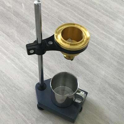 4、将试液注入粘度计时,同时用一手指堵住流出孔,注满后用一金属或玻璃平板在杯刮平,将多余试液刮入粘度计边缘凹槽内,放好承接杯。