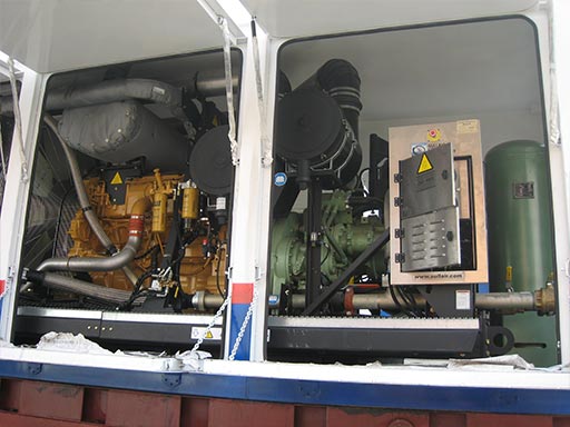 制氮系统设计成撬装式,分别装在二个撬块上。系统分为三个模块,螺杆低压空气压缩机模块、膜制氮系统模块、高压氮气增压压缩机模块。螺杆低压空气压缩机模块和膜制氮系统模块装在一个撬块上,高压氮气增压压缩机系统在另一个撬块上。系统采用风冷式,柴油机驱动,撬块配有金属罩壳。可方便安装在汽车的底盘上,适用于野外作业。