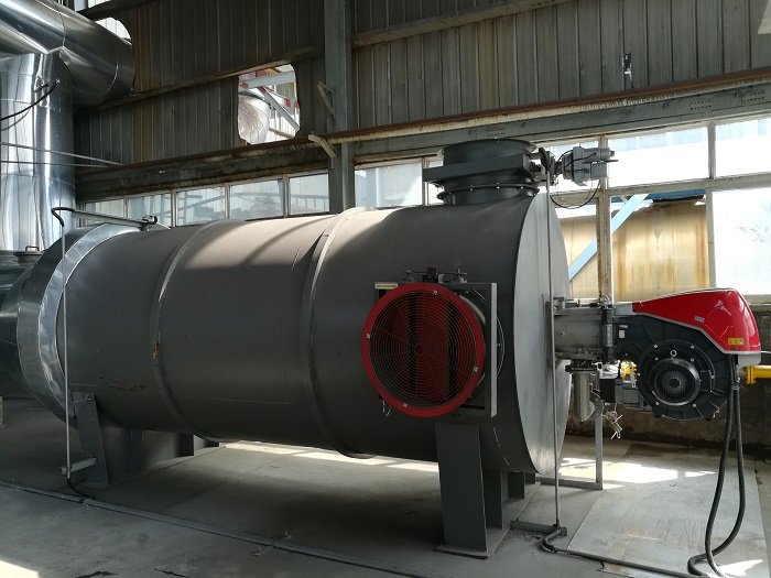 燃气燃油热风炉主要由燃烧器和燃烧室组成。相对于燃煤、燃生物质热风炉,该热风炉燃烧所产生的烟气干净,洁净度高,但燃料成本高。