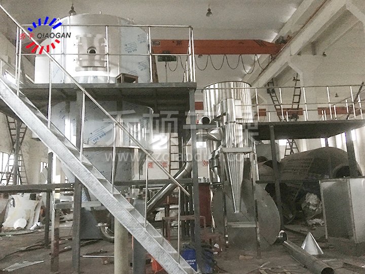 空气经过滤和加热,进入干燥器顶部空气分配器,热空气呈螺旋状均匀地进入干燥室。料液经塔体顶部的高速离心雾化器,(旋转)喷雾成极细微的雾状液珠,与热空气并流接触在极短的时间内可干燥为成品。成品连续地由干燥塔底部和旋风分离器中输出,废气由风机排空。