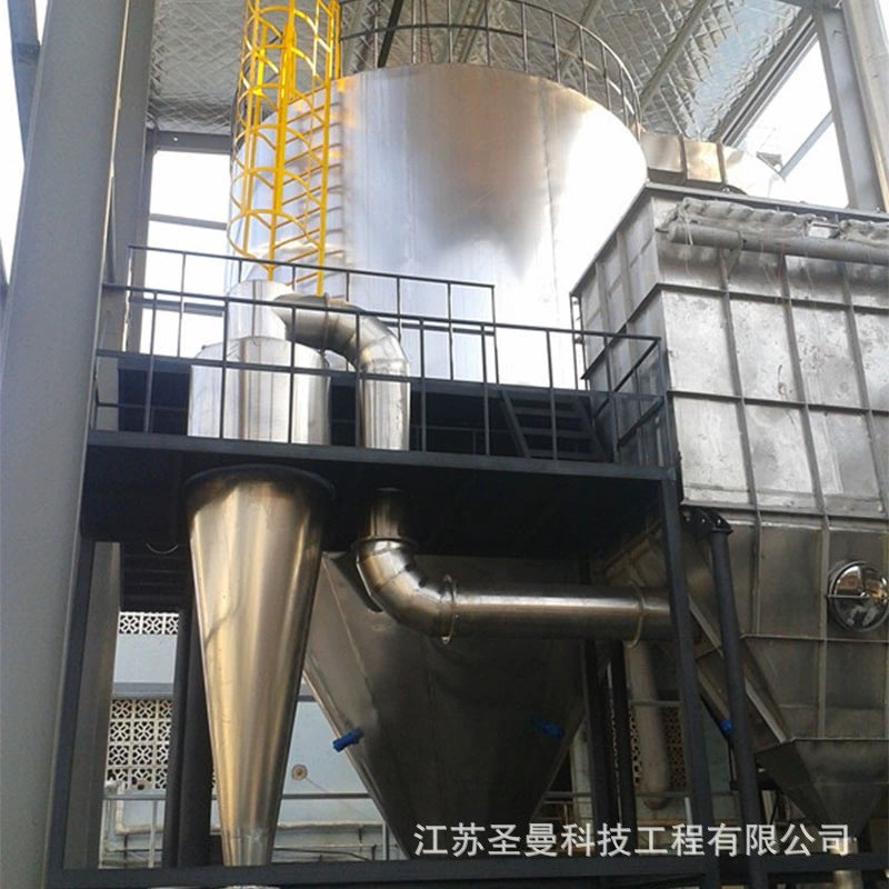 通过设计的空气分配圈和热风分配器,使干燥塔内腔壁附近以及内腔中形成两层逆向旋转存在温度差的螺旋风层,使原材料从高速离心雾化喷头喷出后能与内腔中的热风完成干燥,且对内腔壁进行低温处理,使成品颗粒靠近内腔壁时受到较低温螺旋风层的阻碍,避免其发生过热熔化或离心撞击而黏附在内腔壁上的情况。