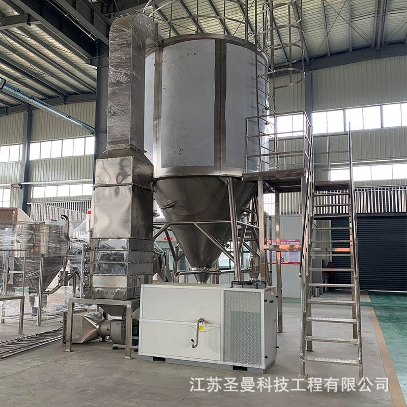 喷雾干燥是快速干燥液态物料的一种干燥方法,在干燥室中将液体物料经雾化后,在与热空气的接触中,水分瞬间汽化,即得到干燥产品,该法能直接使溶液、乳浊液干燥成粉状或颗粒状制品,可省去蒸发、浓缩、粉碎等工序,且得到的颗粒分布均匀。