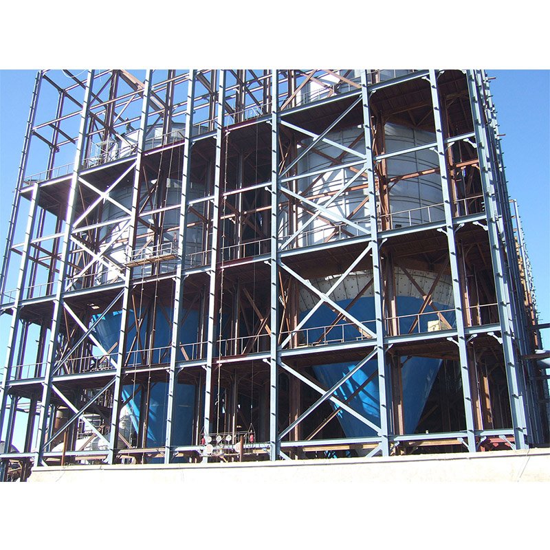 浆料由送料泵送入干燥塔顶高速旋转的雾化器,经雾化器分散成极细雾滴,同燃煤热风炉加热产生的450℃热空气瞬间接触蒸发浆料中的水份,产生的大部分干粉有蒸发塔底排出,少量的细粉有插入管进入旋风分离器,再经缓冲器通过卸料阀排出,尾气由水膜除尘器回收,达到国家粉尘排放标准。在塔底和旋风分离器下设有集中风送管路,通过小引风机抽吸是物料集中进入包装间小旋风分离器下的料仓排出包装,小旋风分离器出口粉尘有小引风机送入塔体,使粉尘达到零排放。