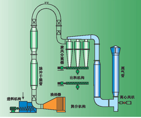 气流式喷雾干燥流程根据工艺的需要可分为两种,一种是上喷式,即喷嘴设置在干燥塔的顶部,雾化后的料液和热风从上向下并流完成干燥过程,适合于粘度较大且具有一定热敏性物料的干燥;是喷嘴设置在干燥塔的底部,雾化后的料液和热风一起从下向上完成干燥过程,适合于耐温性能较好的物料的干燥,传统的小规模的减水剂的干燥原来都采用这种方式。