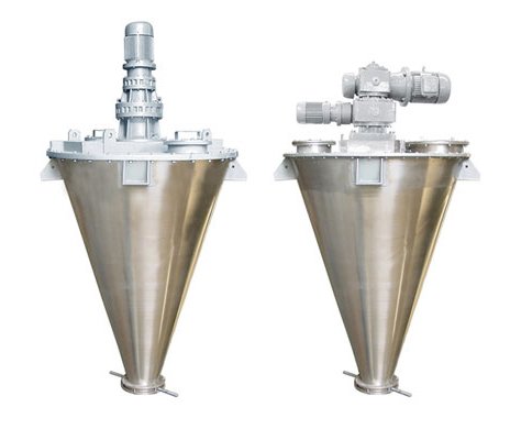 DSH2型双螺旋锥形混合机,它由喷液雾化装置、传动部分、筒盖、螺旋、筒体、出料阀等组成。