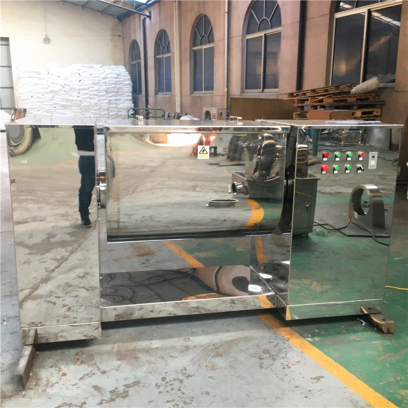 本机为全不锈钢卧式槽型混合机,在制药、化工、食品工业中用于混合物粉状或糊状的物料,使不同比例主辅料混合均匀。本机全采用不锈钢材质,浆叶与桶身间隙小,混合无死角,搅拌轴两端设有密封装置,能防止物料外泄,广泛只用于制药、化工、食品等行业,亦可适用于混合半固体。