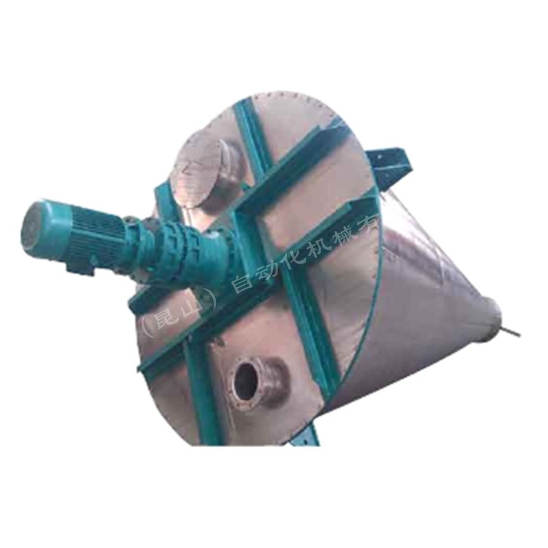 双螺旋锥形混合机(双螺旋混合机)的搅拌部件为两条不对称悬臂(转臂);不同长度,它们环绕锥形容器的中心轴轴线转动(公转)的同时,还借助转臂下方两根螺旋做自转运动; 该设备通过悬臂与螺旋的公、自转使物料反复提升实现混合目的。