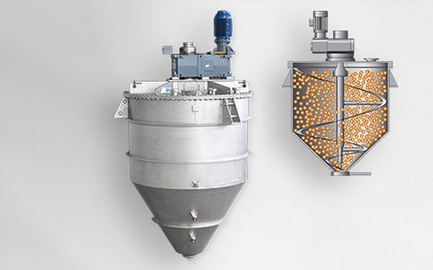 型号具有在结构高度明显降低的同时混合效率出色的优点。旋转的搅拌螺旋(可设计为单叶搅拌螺旋或双叶搅拌螺旋)推动物料沿容器壁向上运行。然后在轴区域中再从上向下进入容器中间,重新加入到混合过程中。驱动装置和轴承安装于物料混合室外部,这样就可以避免在其它混合系统中出现的混合物料被变速器油或润滑脂污染的情况。通过运行的混合设备和锥形的圆锥板可以确保排空时几乎没有残余。通过较大的检查门能够方便的进入容器的圆柱形区域,还可以通过安装
