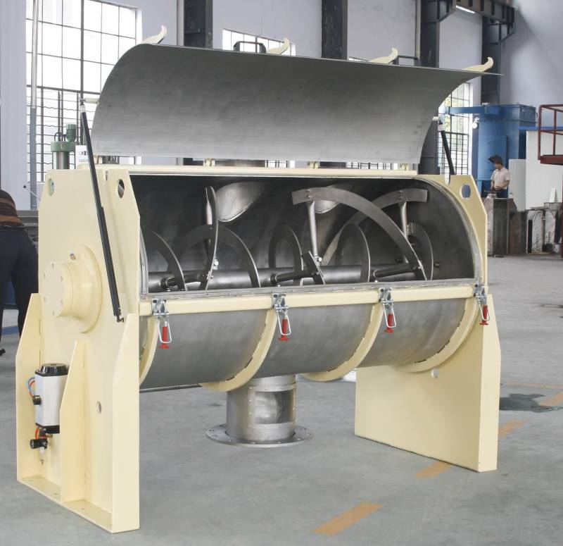 双螺带混合机由驱动机构、双螺带转子和混合简体等部分组成。转子主轴上分布有由内外两条(或4条)不同旋方的螺带,工作时,内螺带推动物料向两侧运动,外螺带推动物料向中间运动;同时,螺带正面推动物料沿螺旋方向运动,螺带背面形成的空洞由上部物料下落后填充。物料形成上、下、左、右全方位的掺混循环。