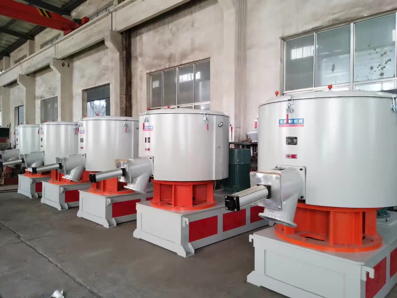由于桨叶的斜面与运动方向成一定倾斜角,所以在搅拌器工作时,对成粉粒状态的物料而言,除产生水平环流式分散外,同时还产生轴向分流式分散。物料被极快地抛向桶壁,沿桶壁摩擦上升,随之又被折流板折流,跌落在桶身中心所形成的涡流中,再度抛向桶壁,如此循环,直至混合结束。物料在混合过程中所需要的热量主要来自摩擦热,因此,在同转速情况下,设备的容积愈大,其剪应力愈高,随之摩擦升温速率愈高。