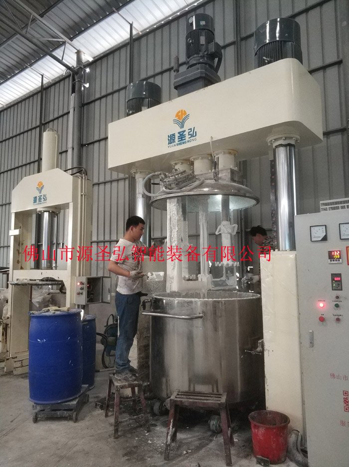 强力分散机采用变频调速,可满足各种工艺要求。分散机釜内有三根不同形式的搅拌器,其中一个搅拌器在绕釜体轴线转动,其余两个搅拌装置又以不同的转速绕自身轴线高速自转,使物料在釜内作复杂的运动,受到强烈的剪切和搓合。设备内山形刮片绕釜体轴线转动,将粘在壁上和底部的原料刮出参与混合,使其效果更为理想。设备密封性好,可抽真空,具有良好的排气除泡效果。