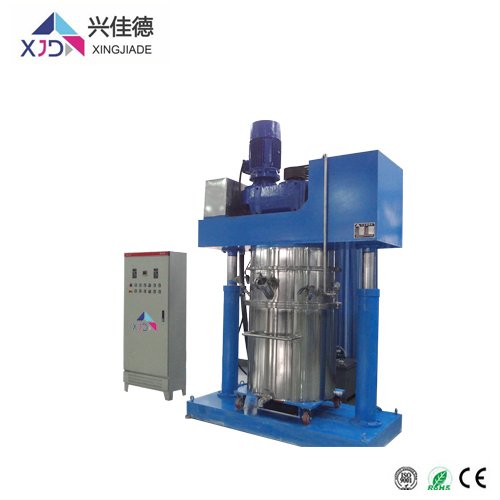 行星架转动时,带动箱内的三根搅拌、分散轴围绕料桶轴线公转的同时高速自转,从而使物料受到强烈的剪切、捏合作用,达到充分分散和混合的目的;在行星架上有一刮壁刀随行星架转动,紧贴桶壁不断的刮拭,使桶壁无滞留料,提高混合效果。搅拌时间的长短根据物料的属性的不同由用户掌握,可通过控制面板调节。封盖及行星搅拌器由双柱液压升降,操作平隐、快捷、轻便。