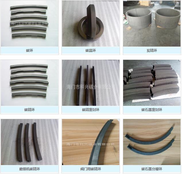产品有:碳环、碳精环(碳晶环)、碳精密封环、碳石墨密封环、磨煤机碳精环、阀门用碳精环、碳石墨分瓣环等各类炭精环石墨制品,产品具有耐腐蚀,耐高温,耐高压的特点。