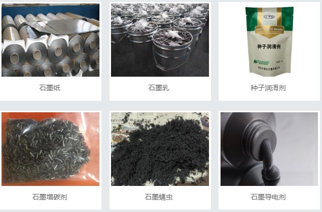 石墨纸、石墨乳、石墨增碳剂、石墨蠕虫、石墨导电剂、种子润滑剂等。