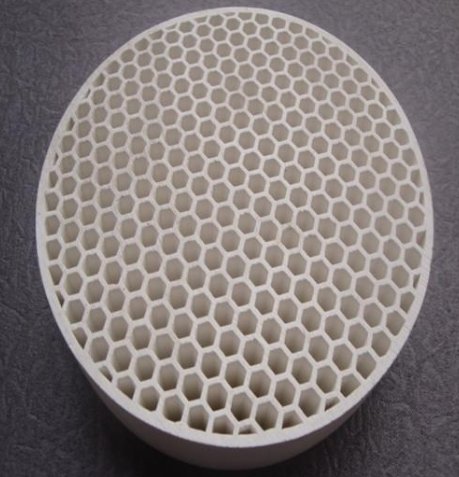 其中尾气的净化是减少环境污染的重要措施之一。汽车尾气催化净化器中,催化剂载体是实现高效尾气净化的一个关键因素。在所采用的载体材料中,主要分为陶瓷载体和金属载体两种,但得到广泛应用的是蜂窝陶瓷载体。蜂窝陶瓷是可由多种材质而成,主要材质有:堇青石、莫来石、钛酸铝、氧化锆、碳化硅质及堇青—莫来石、 堇青石—钛酸铝等复合基质。其中堇青石(MgO•AL203•Si02)蜂窝陶瓷是以堇青石晶体为主晶相,其造型像蜂窝状的一种多孔陶瓷,它具有强度大、低膨胀、耐热震性好、吸附性强、 耐磨损等优点而成为*常用的整装汽车尾气催化剂载体,能够满足国Vi尾气排放标准要求。汽车用蜂窝陶瓷载体的使用环境特别恶劣,同时其又是后排放处理系统中的一个零部件。因此,对其系统的协调适应性也要求非常高。汽车尾气净化器对其蜂窝陶瓷载体的主要要求是:与催化组份无化学反应、一定的机械强度、热稳定性和抗热震性好、热膨胀系数小以及较高的比表面积等,满足上述性能要求。