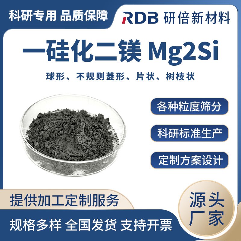 一硅化二镁(Mg₂Si)粉末由上海研倍新材料通过熔盐法、机械合金化法或粉末冶金法制备而成,具备纯度高、粒径均匀、化学稳定性良好的特点。作为典型的金属硅化物,Mg₂Si 晶体呈现反萤石型立方结构,镁(Mg)与硅(Si)原子间的化学键合赋予其独特的物理化学性能。它具有较高的硬度和良好的热稳定性,熔点约 1085℃ ,在高温环境下能保持结构稳定。Mg₂Si 是一种窄禁带半导体材料,具有良好的电学性能,在一定条件下可实现高效的电子传导;同时,它还具备较好的化学惰性,在多种化学介质中不易发生反应。这些特性使一硅化二镁成为冶金、电子、能源等领域重要的基础材料。