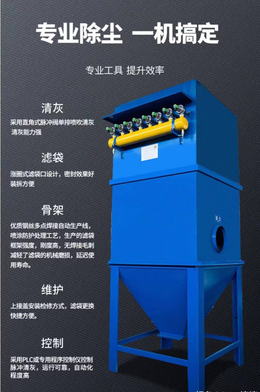 布袋脉冲除尘器: 为箱体结构,主要由桁架、灰斗、中部箱体、上部箱体、喷吹装置、梯子及平台、进出口风管、PLC控制系统八部分组成。
