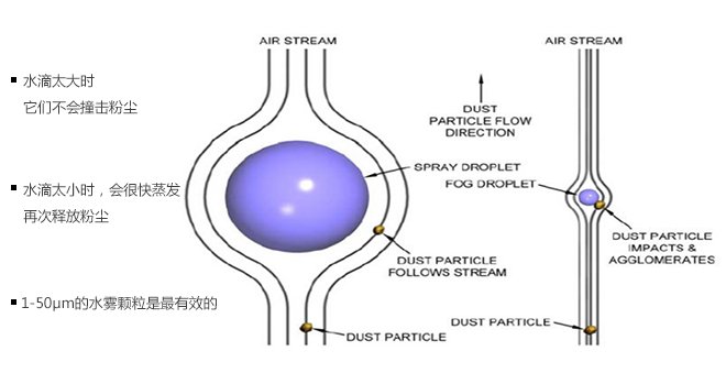根据粉尘聚合理论和空气动力学理论,粉尘颗粒一般直径在0.1um-75um,当粉尘颗粒与比它体积大得多的水滴相遇时,会被水滴旁边的空气流(流速更快)带动前进而不与水滴相碰。而与粉尘颗粒大小相接近的雾滴,表面张力小,易于和粉尘结合,使微雾颗粒与粉尘颗粒相互碰撞、粘结、聚合增大,并在自身重力作用下沉降,达到抑尘目的。 POTA会根据粉尘粒径特性,选择合适的喷头(高压单流或气水混合双流),产生对应粒径的雾滴,改变水的表面张力,大大增强雾滴捕捉粉尘的能力。