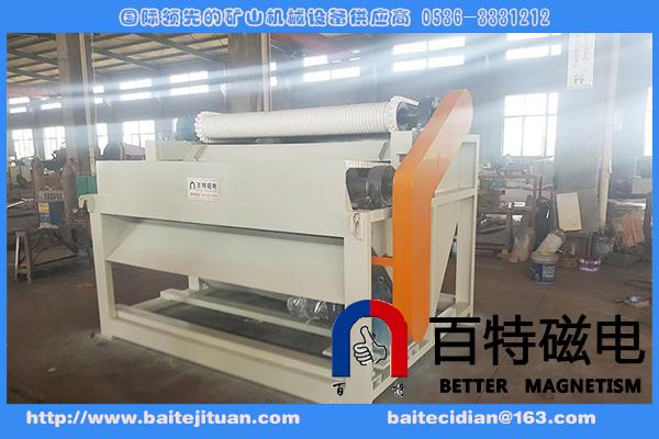 含有铁磁性物质的物料由受料斗经过电磁振动给料机均匀的下到**条输送皮带上,当物料通过一选强磁辊时,铁磁性物质由于受磁力的吸附作用被吸附到强磁辊上,随着皮带的转动使其脱离磁场并下落到收集斗中。其它物料和没有选净的铁磁性物质随溜槽进入下一级磁选皮带完成选别,原理同上。*后选出符合要求的合格产品。