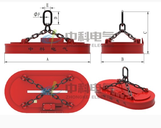 铁芯、线圈、链条、钟盖、吊耳、出线盒、非磁性保护板等安装位置通常安装在行车吊钩上,当多台连吊时安装在特制横梁上;安装在抓钢机、起重机上;安装在焦化炉上用来揭开炉盖;智能生产车间上料、下料用。