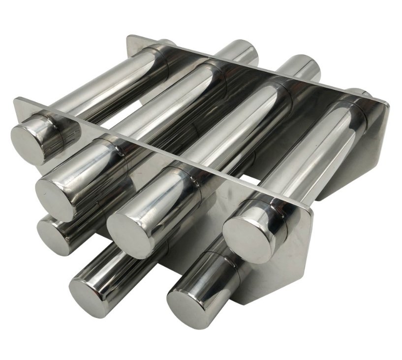 磁力架,又叫做磁格栅,是由磁棒根据不同的使用要求按照不同的形状尺寸,通过不锈钢板固定成型。磁力架可以安装在投料斗、出料口、输送管道等处,当物料流经磁格栅时,铁杂质就会被牢牢吸附在磁棒上,从而实现净化物料、保护下游设备安全运转的效果。磁力架可以用来过滤粉体、颗粒、液体、气体物料中夹带的细小铁杂质。