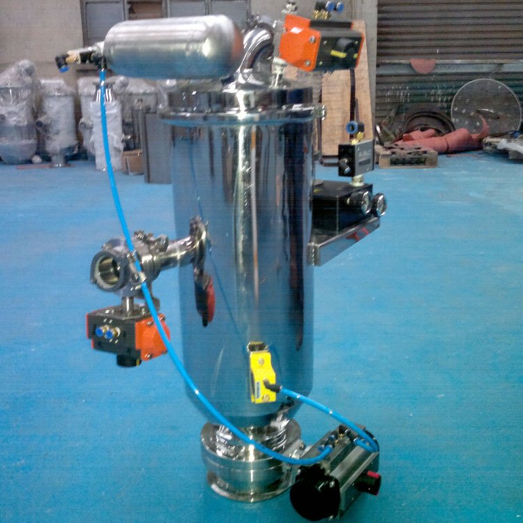 4、出料时,气动控制器自动控制反冲气囊吹扫过滤仓滤芯,使其可被清洗再生使用。输送粘稠物料时,可选用活塞振动器等助流器来提高出料效率。