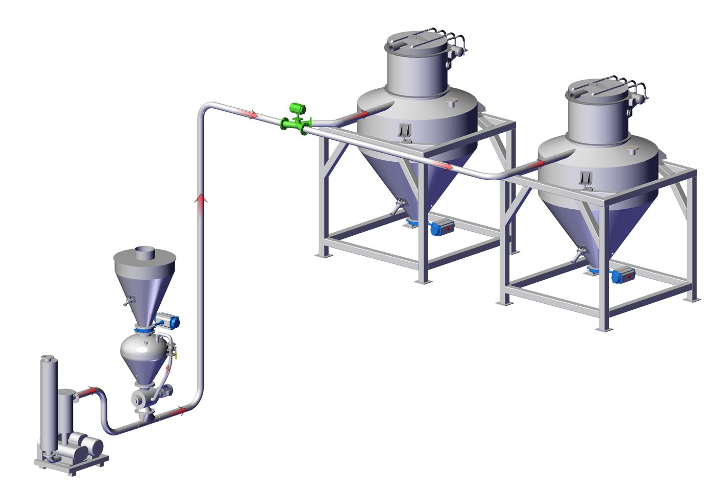 正压稀相也称正压气流输送系统或者是气运输送系统,都是以鼓风机(如罗茨风机)输出的气流为载体将散装粉粒体物料用气流输送进入指定的设备, 通过旋转加料器或螺旋给料器将粉粒体物料卸入管道进行压送,输送压力根据工况不同并根据物料不同,可在几千帕到几百千帕范围内调整。