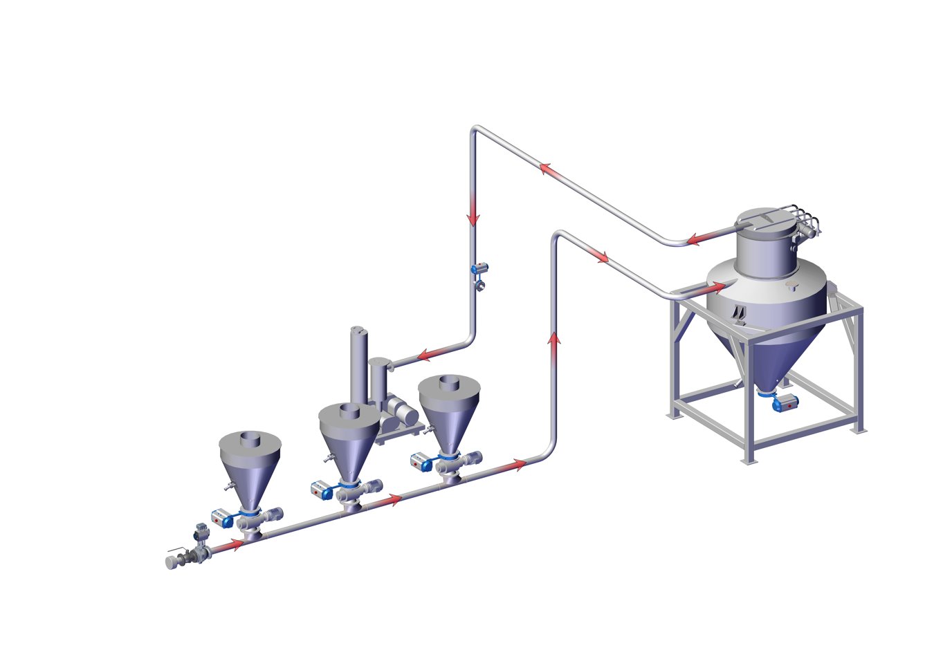 负压稀相气力输送系统是利用低于1kg的气体压力,采用负压的方式,使用较高的空气速度来吸送物料,使其通过整条输送线,因此该输送方式被称之为低压高速系统,它具有较低的气体物料比。