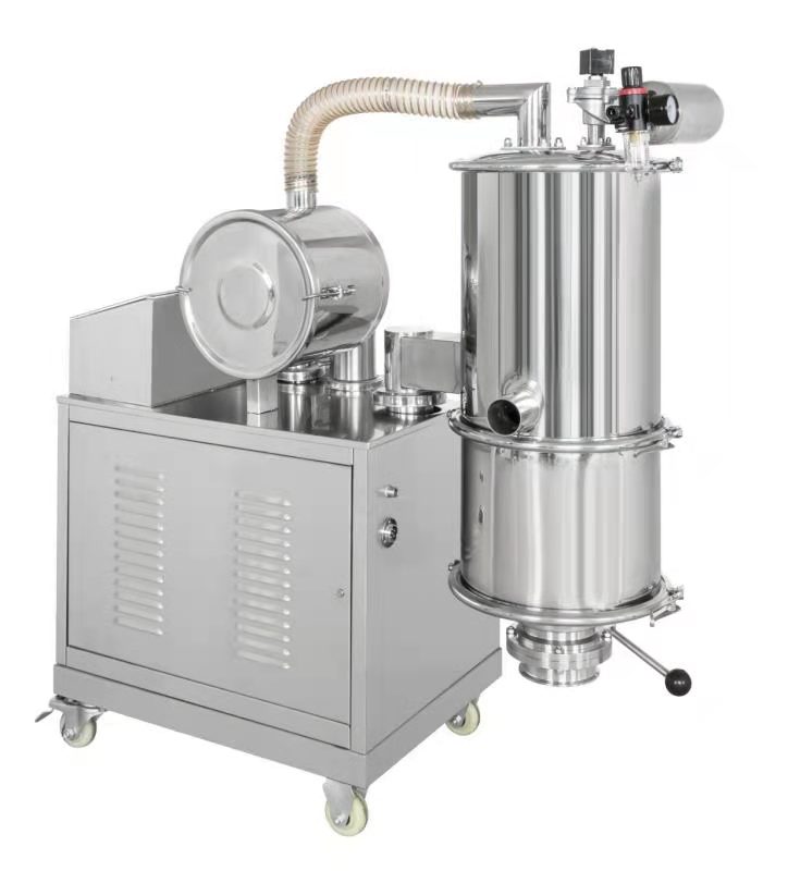 混合式真空加料机由可移动小车、真空泵、粉尘回收桶、过滤器、吸料管和电器控制箱组成。所有的部件集中装在移动式机架上,外形美观,使用方便。