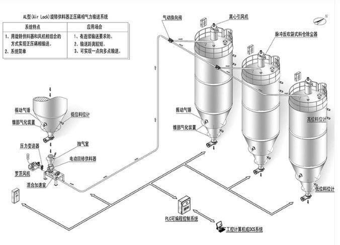 正压稀向输送系统:稀相输送:固体含量低于1-10kg/m3,操作气速较高(约18~30m/s),输送距离基本上在300m 以内。一般采用罗茨风机作为动力源,通过旋转阀或螺旋喂料机将粉粒体物料卸入管道进行压送,输送管道能灵活的布置,可实现一个点至多个点的输送,从而使工厂设备工艺配置合理;系统密闭,粉尘飞扬逸出少,环境卫生条件好;运动零部件少,维修保养方便,易于实现自动化。