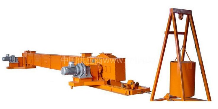 | 由结构图可以看到:在封闭的钢板箱体(序号10)里面,左右两端各安装着一个同步转动的链轮(序号17),其动力传递依次为:电机(序号3)→摆线针轮减速机(序号2)→十字滑块联轴器(序号16)→链轮。链轮上的圆周沟槽中紧绷着两条首尾相接的钢丝索(序号8),其相对关系类似三角皮带与皮带轮的关系。钢丝索上固定着刮板(序号4)、防侧偏轮(序号5)、托轮(序号6)。一端链轮的轴线为固定不动;另一端链轮的轴线沿调节驱动架(序号15)可调,调整钢丝索的绷紧程度。箱体上面有数个(序号9)进粉口;箱体下面有数个(序号21)出粉口;箱体的两端各有一个回粉口(序号14)。进出粉口的数量与位置视用户需要而定。箱体的长度系由单节拼接而成。每一单节长度1500mm左右。 |