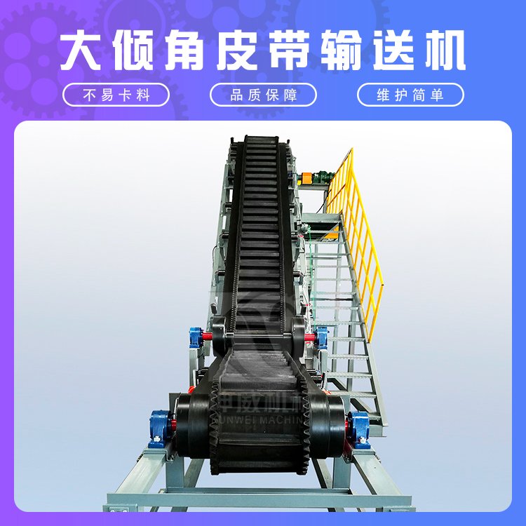 1、大倾角皮带输送机又叫波状挡边带式输送机,它使用的是有波状挡边和横隔板的输送带,是一种新型连续输送设备,它具有输送量大(同其它输送机相比,输送能力提高1.5~2倍)、结构紧凑、占地少等优点。