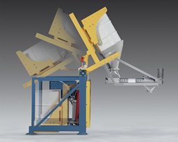 液压倒桶机是我司根据美国公司技术,在中国大陆生产的新一代倒桶机构。它具有安全、省力、少尘等特点。其采用液压动力,控制器通过电磁阀驱动夹桶液压缸和翻转液压缸,夹桶液压缸将夹桶架及容器桶上升,夹紧在不锈钢倒料桶的橡胶密封圈上,然后翻转液压缸驱动翻转曲柄,带动翻转架翻转,翻转到位后,打开放料阀门进行放料。为了放料彻底,可以启动气动振动器。