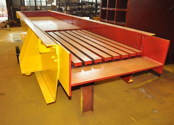 振动给料机专为破碎筛分中粗破碎机前均匀输送大块物料设计。振动给料机采用双偏心轴激振器的结构特点,保证设备能承受大块物料下落的冲击,给料能力大。在生产流程中可以把块状、颗粒状物料从贮料仓中均匀、定时、连续地给到受料装置中去,从而防止受料装置因进料不均而产生死机的现象,延长了设备使用寿命。给料机可分为钢板结构和篦条结构,钢板结构的给料机多用于砂石料生产线,将物料全部均匀地送入破碎设备;篦条结构的给料机可对物料进行粗筛分,使系统在配制上更经济合理,在破碎筛分中已作为必不可少的设备。