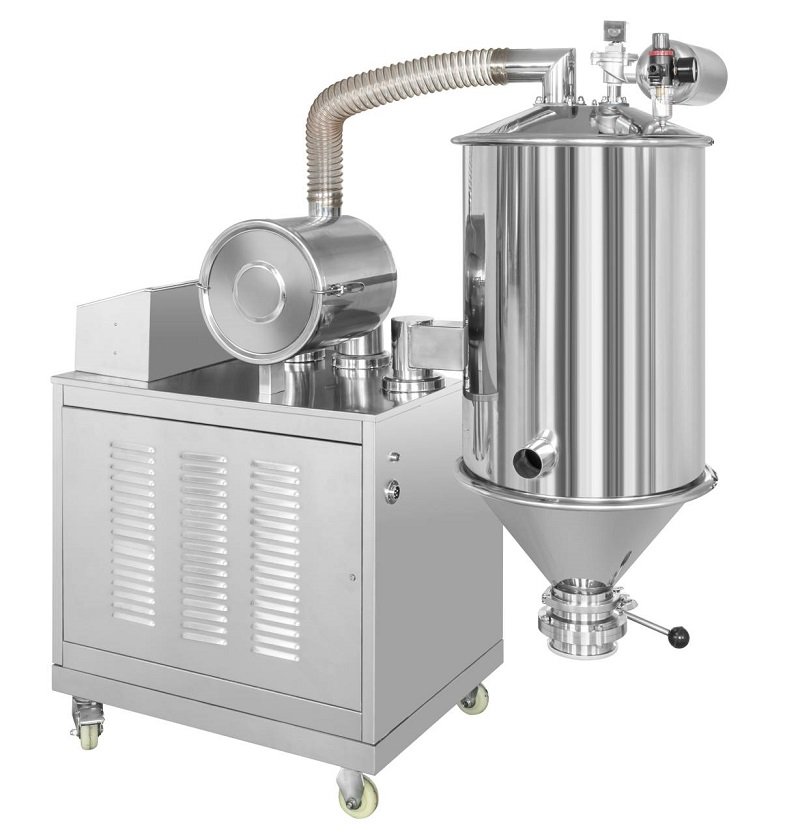 混合式真空加料机由可移动小车、真空泵、粉尘回收桶、过滤器、吸料管和电器控制箱组成。所有的部件集中装在移动式机架上,外形美观,使用方便。