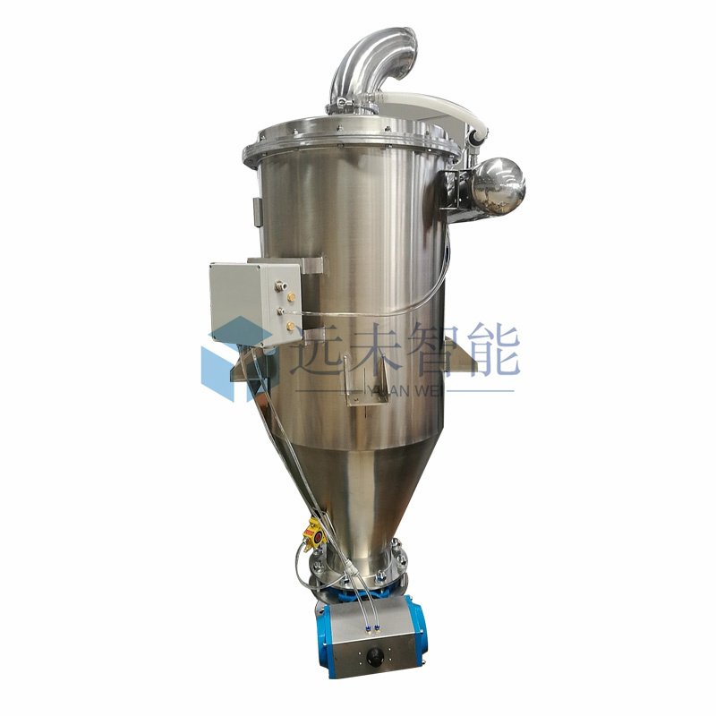 真空上料机工作原理是利用真空动力源将真空上料机仓体抽成负压状态,同时补充空气,使空气形成流动的同时带动物料沿管道移动。物料被吸入真空上料机后,被仓体内的滤芯隔断,空气滤过,物料暂存在仓内。当吸料时间到达后,真空上料机出料阀门打开,物料就被放入客户设备中。设备自带脉冲反吹气包,每个循环都会对滤芯进行喷吹,防止堵塞。