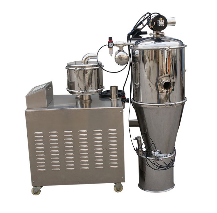电动真空上料机由真空泵(无油、无水)、不锈钢吸料咀、输送软管、过滤器、压缩空气反吹装置、气动放料门装置、真空料斗和料位自动控制装置等组成,整套系统设计合理、制造精美。