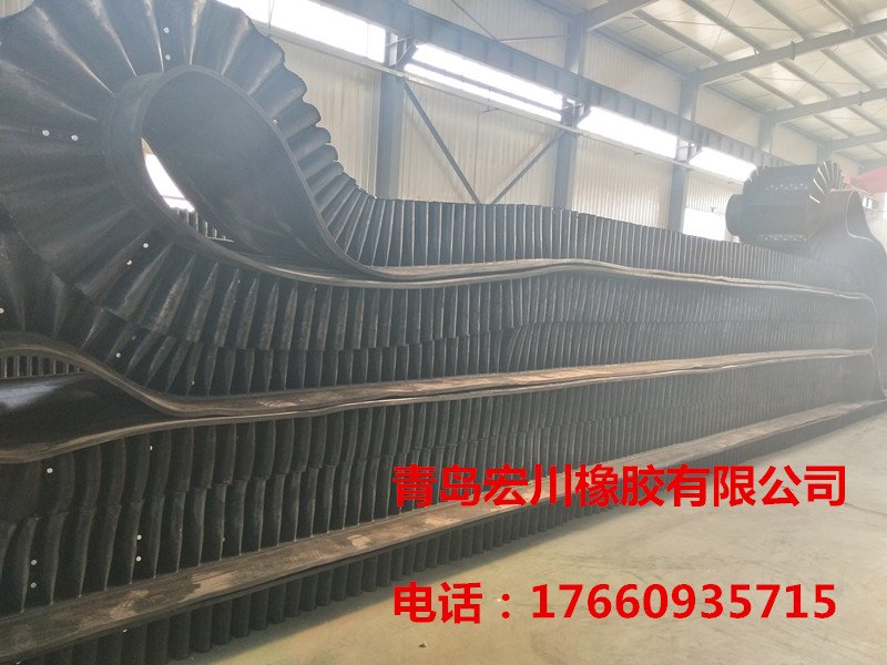 为便于绕过滚筒,档边设计成波纹状;横隔板的作用是承托物料,为了实现大倾角输送,采用T型TC型。档边和横隔板是用二次硫化的方法与基带连接的,具有很高的连接强度。用于输送易散落的粉状、粒状、小块状、糊状及液态状物料。其特点:适用于倾角0°~90°散装物料的输送;具有使用范围广、占地面积小、无转运点、减少土建投资、维护费用低、维修容易 输送量大 连续化、高效率、大倾角运输,操作安全,使用简便,,运费低廉,并能缩短运输距离,降低工程造价,节省人力物力等特点;解决了普通带和花纹带所不能达到的输送角度;还可根据使用环境,设计成完整、独立的输送系统,避免了间断输送和复杂输送的提升系统。可沿水平、倾斜、垂直和变角方向输送各种散装物料,从煤、矿石、沙子到化肥和粮食等。物料粒度不限,可从很小的粒度到400mm的大粒度,输送量可从1立方米/小时到6000立方米/小时。
