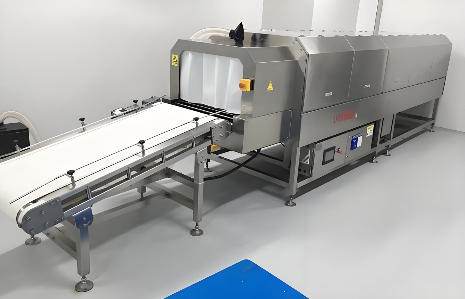 该款杀菌机主要用在原料脱包后,对袋子表面进行吹扫和紫外线杀菌,可根据输送速度来调整杀菌时间。标配有:进出输送带、风淋段、紫外线杀菌段、PLC-触摸屏控制。具有杀菌效果好、稳定性高、抗干扰强、耐腐蚀、方便清洁等特点。