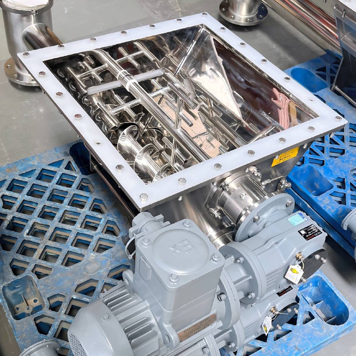 不锈钢双螺旋轴,可同步旋转推动物料,显著提升输送能力,特别适合流动性较差或易架桥的粉体、颗粒状物料。
