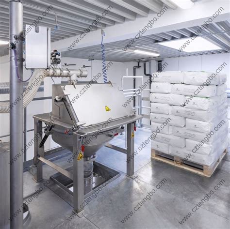 标袋拆包机又称手动拆包机或倒袋站,它本体包含了—个过滤除尘系统,结构紧凑。通过除尘系统回收的物料靠重力落进料斗。操作人员将料袋放在支架上,并将其推入铁格内。接着,操作人员将料袋划开—个竖向的口子,并抖动料袋使其清空。料袋内的物料可以通过料斗传送至喂料机内。内置的滤材由风机驱动,空气喷射清洁式收尘过滤机可以对料袋清空过程中生产的粉尘进行收尘。已清空的料袋人工取走,集中处理。
