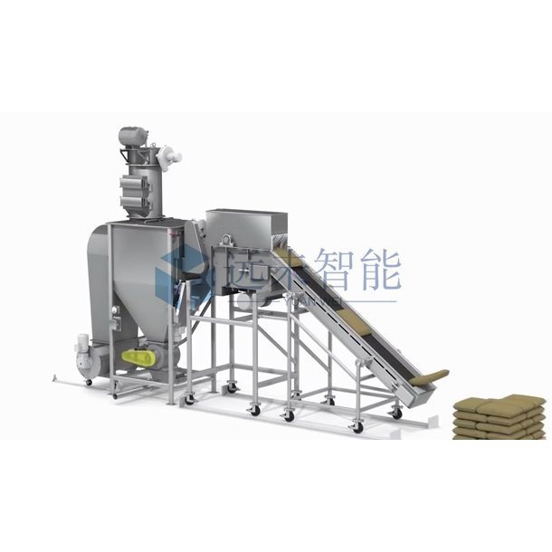自动拆包机主要是对袋装粉粒体物料进行拆袋卸料作业,由自动送料装置或人工将料袋进行上袋,通过上袋输送机自动将袋装粉粒物料传送至45度角的滑板上,并依靠料料袋其重力沿滑板下滑,在下滑过程中由快速旋转的刀片将包装袋割开,被割开的残袋和物料滑入物袋分离器进行筛分,从物袋分离器分离出来的物料由物料收集器收集并通过斗式提升机输出到储存器内(也可用密相气力输送装置或稀相气力输送装置,输送至物料储罐中)。物袋分离器分离出的破损包装袋、杂质、结块物料被输送出去,割刀拆袋过程中引起的粉尘由布袋式除尘器捕捉并抖落入物料收集,作业中产生的粉尘被设备自带的除尘装置过滤净化,不至于污染环境,又能使工厂操作工人能在清洁的环境中连续工作。