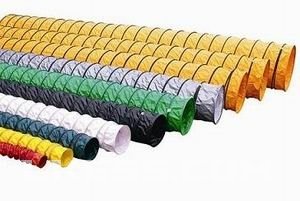 耐高温伸缩风管410由塑料胶骨包裹钢线为骨架,以桔塑料夹网布为管身,两头管口处串有绳子可方便套接风口,管身处每隔一米有一金属吊环,可方便固定风管,它的耐温范围为-30——120度,它的阻燃指数在B1级以上。耐酸碱/耐高温/耐磨和耐老化等.产品伸缩弯转、驳接自由、体积轻巧、携带方便、耐高温、耐酸碱且阻燃、绝缘。