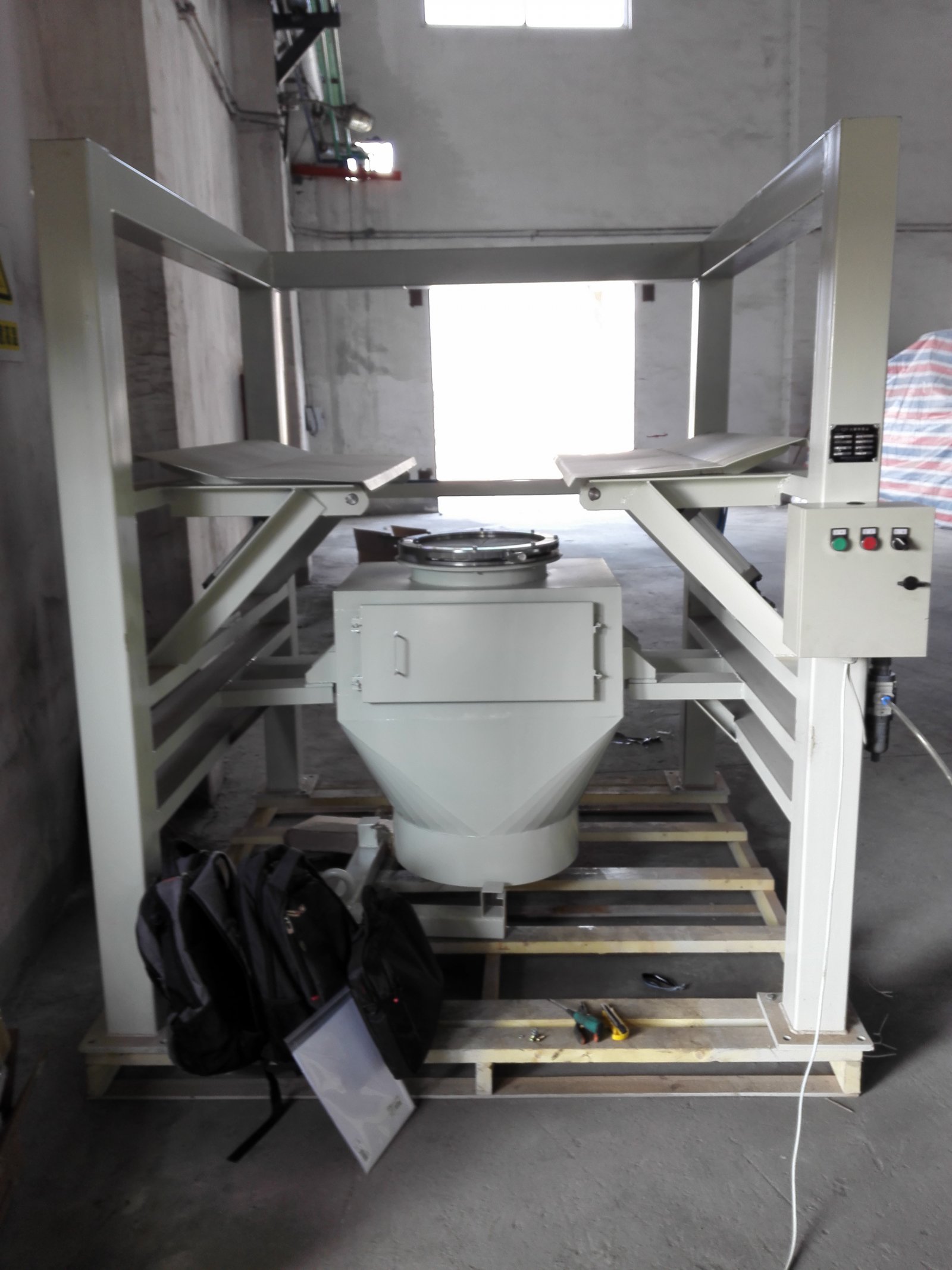 大袋拆包卸料机将吨袋包装物料提升到进料口,人工将包装袋下料口拆开后,打开流量控制阀和附带的振动下料装置促使包装袋内的粉粒状物料通过自重落到下方料斗中。