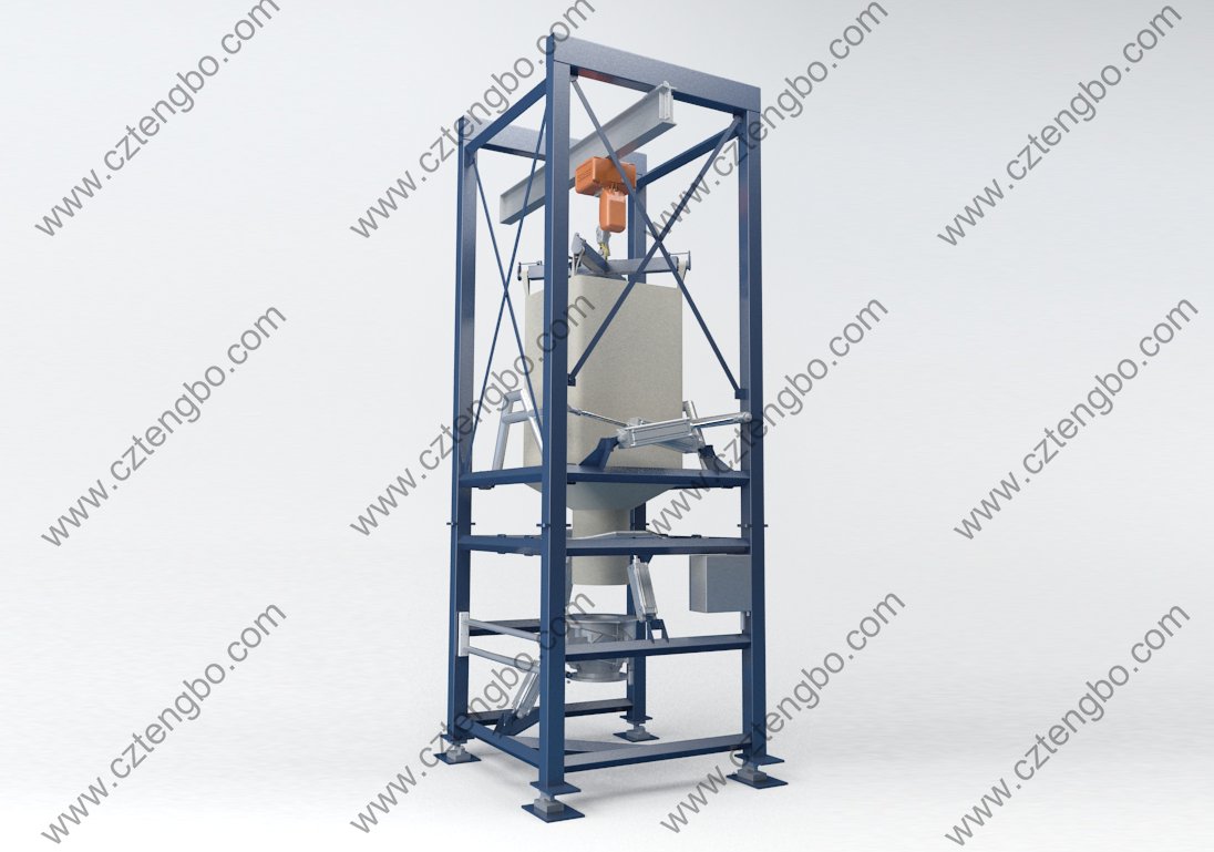 大袋拆包卸料机将吨袋包装物料提升到进料口,人工将包装袋下料口拆开后,打开流量控制阀和附带的振动下料装置促使包装袋内的粉粒状物料通过自重落到下方料斗中。