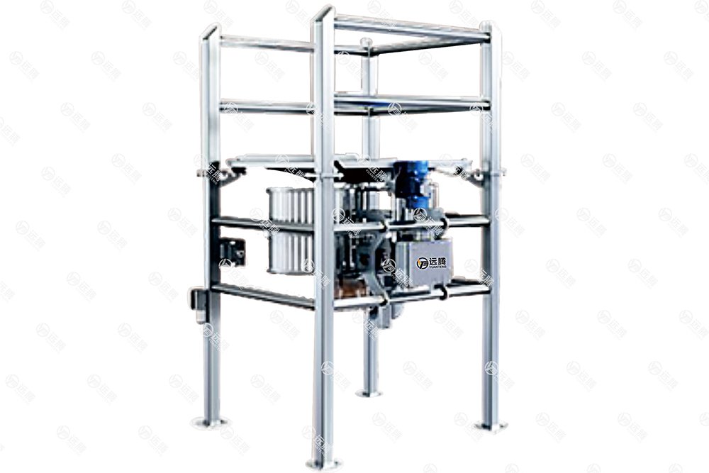 通过叉车或者电动葫芦提升吨袋至进料口,人工拆开吨袋下料口,打开阀并辅以振动装置促使吨袋内的粉粒状物料依靠重力下落至储存仓或者下一个工位中,从而完成拆包卸料工作。